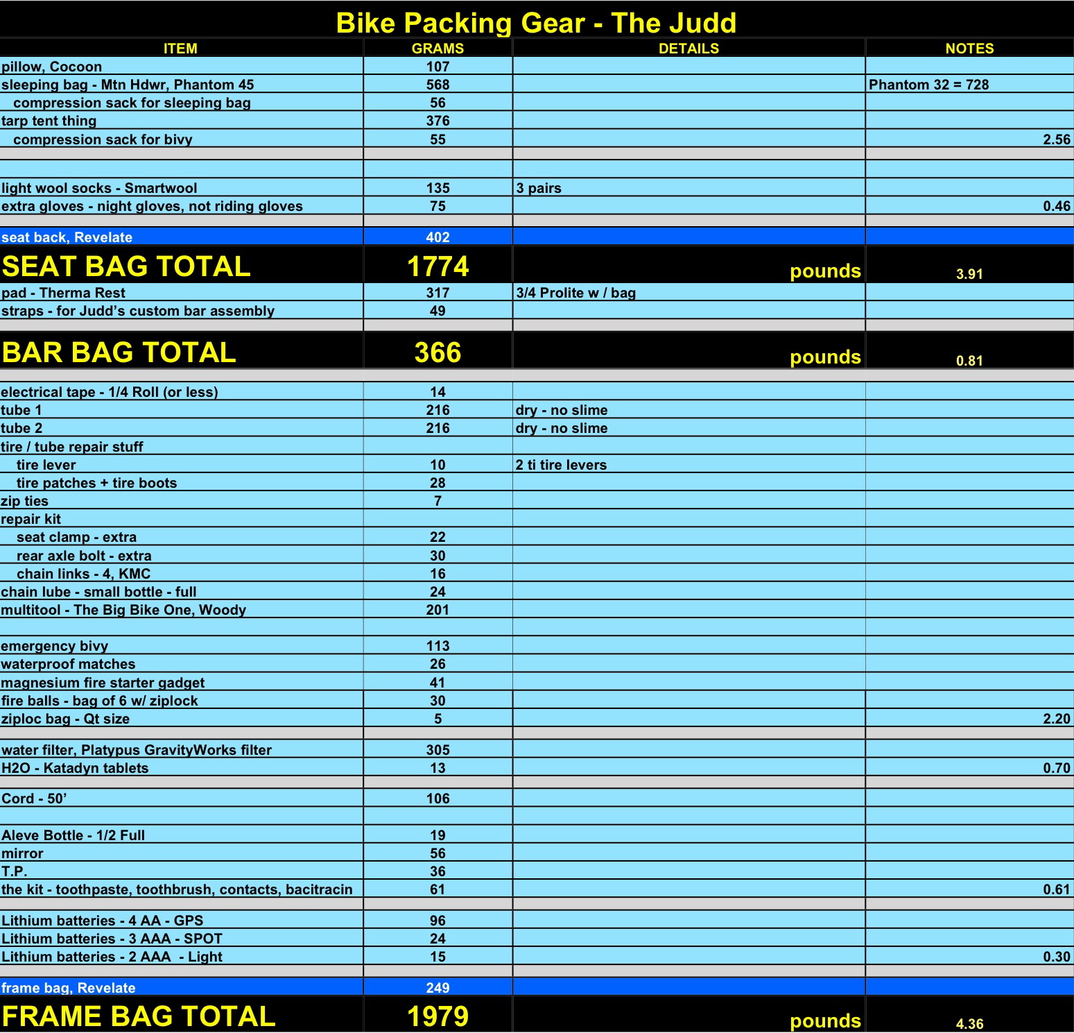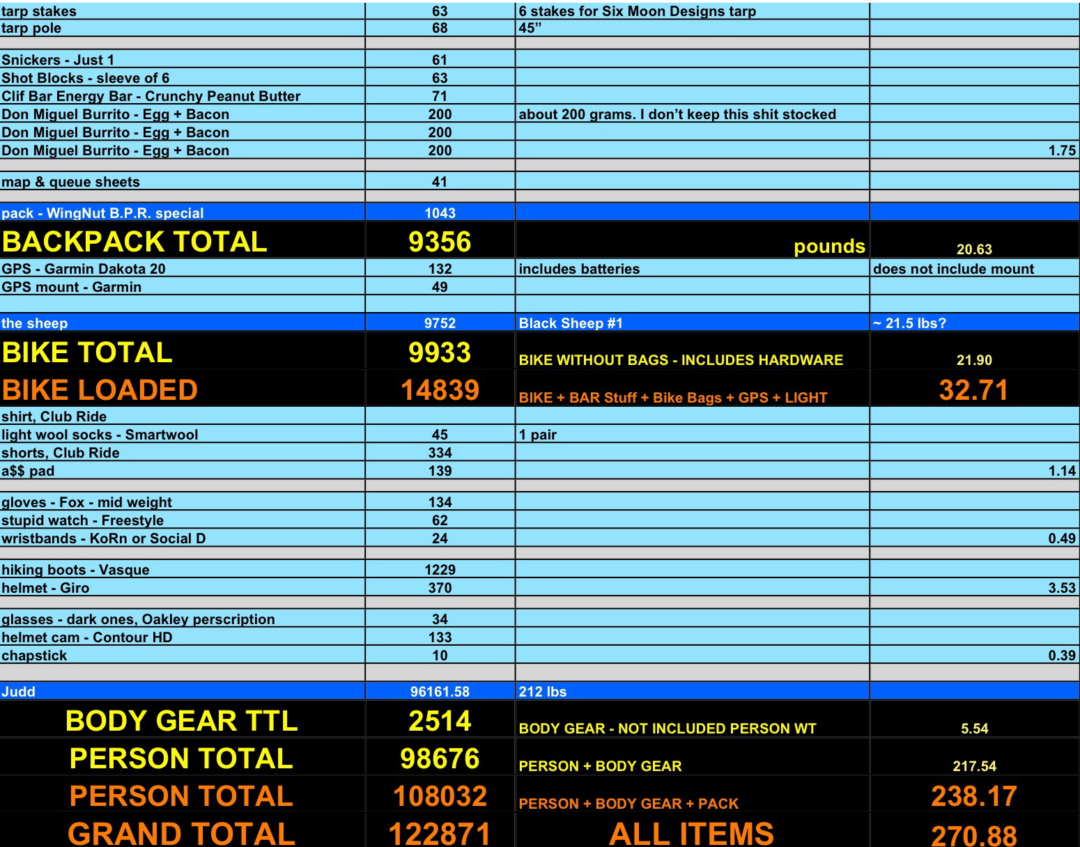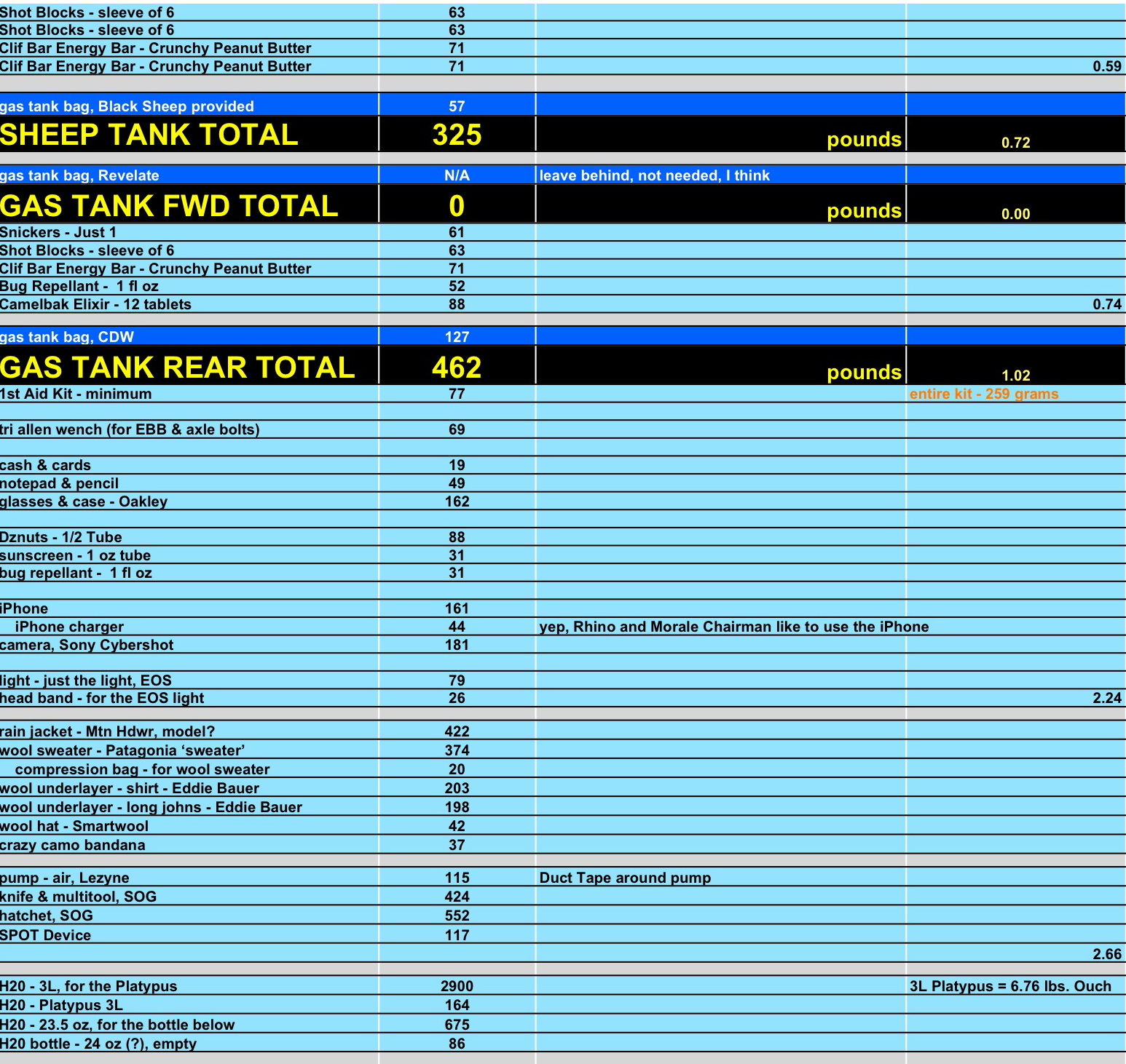 I’m not a weight freak. Mad Rhino is a weight freak. The Morale Chairman is a control freak. Prob-eee is a hippie freak. The Lt Col is just a freak. Yep, I’m a data freak. Below is my data based on Super Nick’s spreadsheet and some of Mad Rhino’s additions.